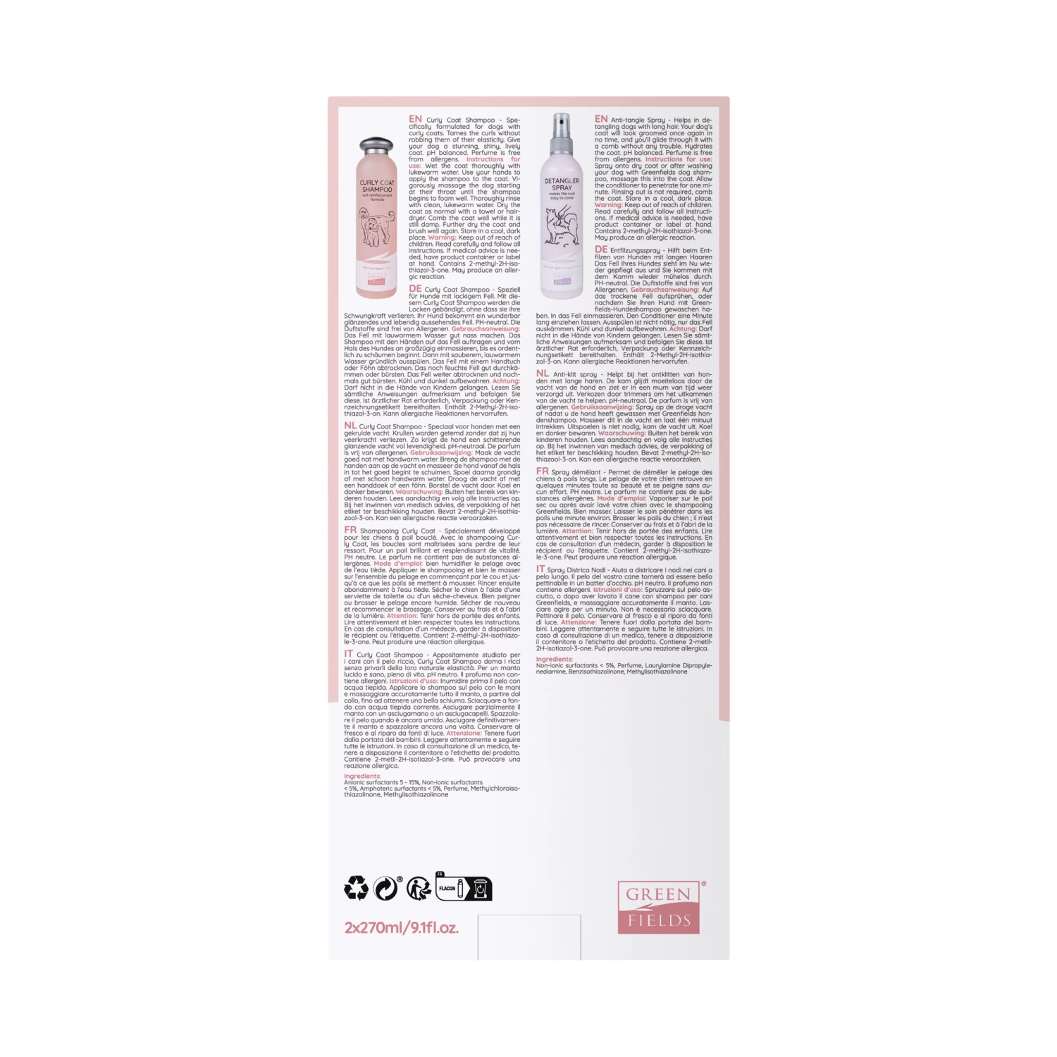 Op zoek naar vachtverzorging speciaal voor uw hond met een krullende vacht? De Labradoodle Care Set van Greenfields bestaat uit een shampoo en een anti-klit spray. De Curly Coat Shampoo verzorgt de krullen van uw hond zonder daarbij de natuurlijke oliën van de huid aan te tasten. De shampoo draagt bij aan een pluisvrije, glanzende en veerkrachtige vacht. De Detangler Spray is voorzien van kamille extracten, die helpen om de vacht zacht en glanzend te maken. Na gebruik glijdt de kam moeiteloos door de vacht. Zo ziet uw hond er weer op en top uit!